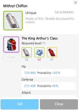 當您任意點一個材料 ,您便能看到該材料能和哪些材料合成,鑄造一個新的裝備,同時下方亦有出售 SELL 的選擇,您亦可以標好價格直接將它出售到市場中。