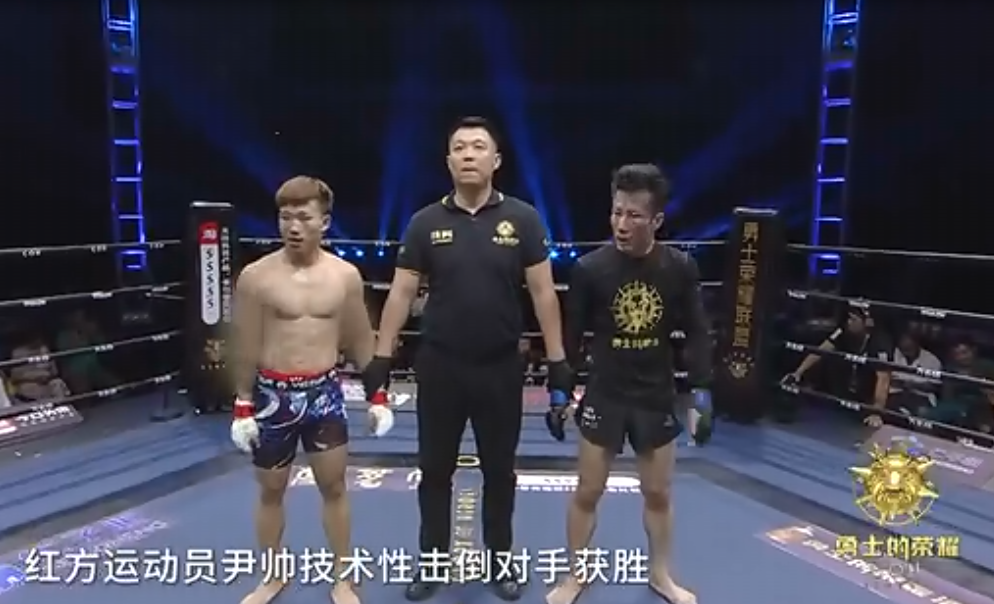 6月22日19:00,在国内最著名的格斗赛事---《勇士的荣耀》信宜站,中国小将尹帅在综合格斗规则蝇量级比赛中,于第二回合2分39秒,强势TKO日本选手松元仁志。