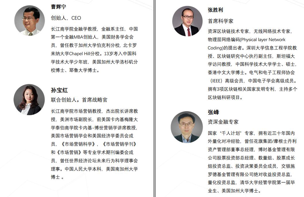 再来看看团队,不可谓之不豪华。长江商学院在国内经济领域的地位很多人都了解。这里有教授,资深区块链专家,国家“千人计划”专家和营销教授等组成的豪华团队,实力,经验和资源可以说是完美结合。俗话说好马配好鞍,好的团队就是成功的一半。