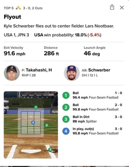 值得一提的是,這一屆日本隊 ERA 全隊最高的是達比修有,總共 投了 6 0/3 局被擊出 7 支安打,ERA 6.00,包含被炸 3 發全壘打(這場 Schwarber 也炸一支)。