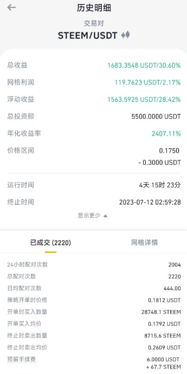 - 如果想要赚得多,就需要自己能判断是否在阶段性的低点。我个人经验来看,现货网格机器人更像是左侧建仓(左侧建仓的意思就是在阶段性低点的左边建仓)。浮盈应该是我们开设机器人网格单的目标。如果你想要无脑开单,那么你就只能死扛到浮盈,甚至永远也等不到浮盈(比如在 0.175 -- 0.275 开网格单后,价格飙升过 0.275 后再也不回头),只能割肉结束机器人订单。