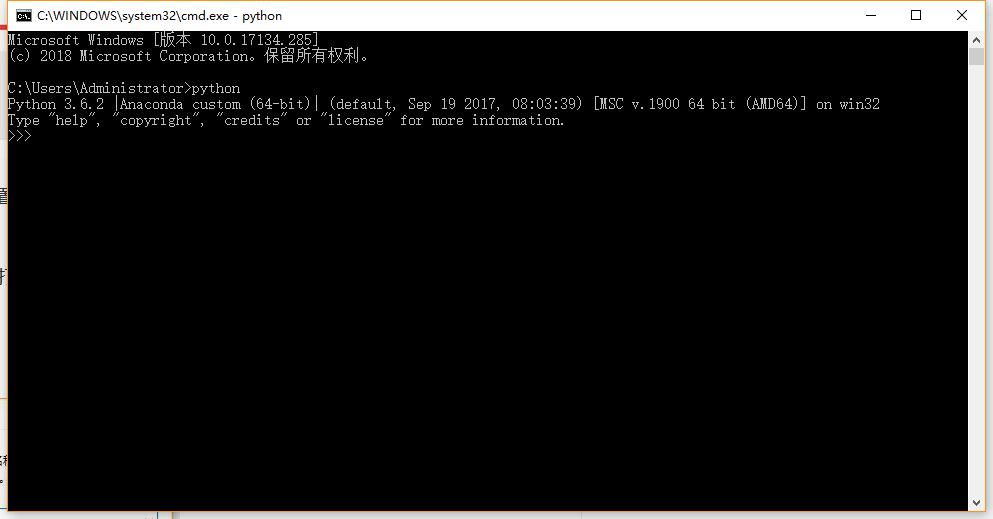 进入命令行后输入python,如果安装成功就可以看到python的版本,以及python的交互输入>>>