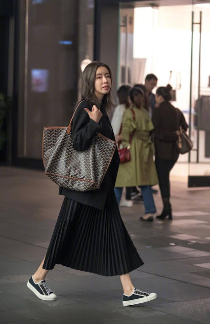小姐姐一身黑色的套裝顯得低調有內涵,上身一款黑色的西裝比較偏向於職業女性的氣息,下身搭配了一款黑色的百褶半身裙,搭配腳上一款黑白色相見的運動板鞋,身旁的背著的包包真的是超大size,超級實用。