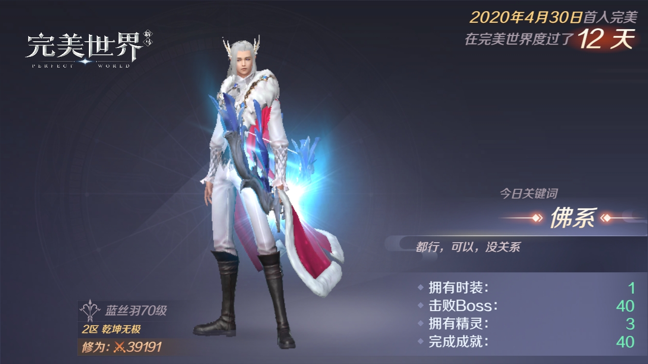 【完美世界】我的游戏记录 - 第十二天icecoffee (49)in #cn • 6 years ago 十一号打卡 把美丽与英俊集于一身的角色美照留下来。 11/05/2020 今天是我在完美世界的第十二天,我已经升到70等级啦! 一身白衣绝对是白马王子的feel... 不知道我这个游戏能够坚持玩多久呢?毕竟是旧的服务器,里面的玩家已经到很高很高的等级,我完全追不上。 一个人在游戏里也是挺寂寞的... 只好一个人在那里静静的唱: 我寂寞我寂寞就好~ 🎶 #game #steemace #zzan #upfundme #palnet #actnearn #marlians #diamondtoken #dblog