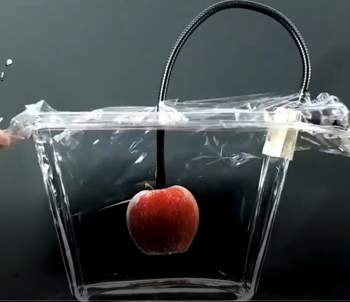 将苹果顶部固定在支架上,最大限度保证其位于容器中央。接着往容器中倒水并全部加满,让苹果与空气完全隔绝。最后,为了防止水分蒸发,在上面封了一层保鲜膜。