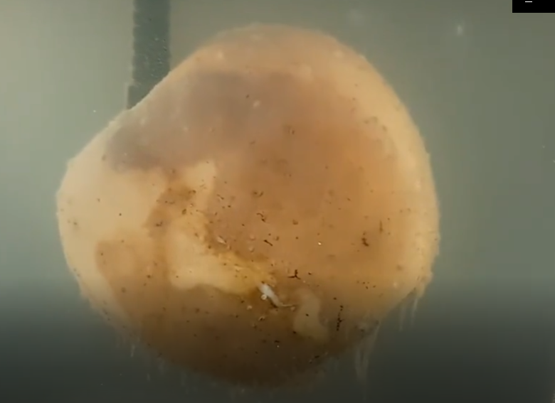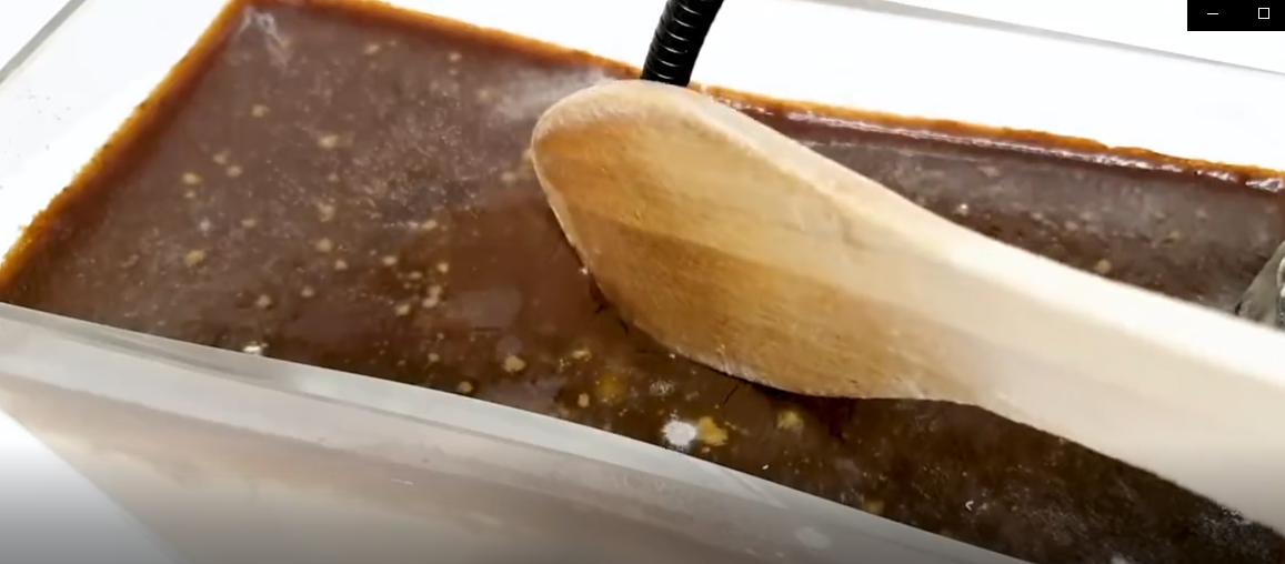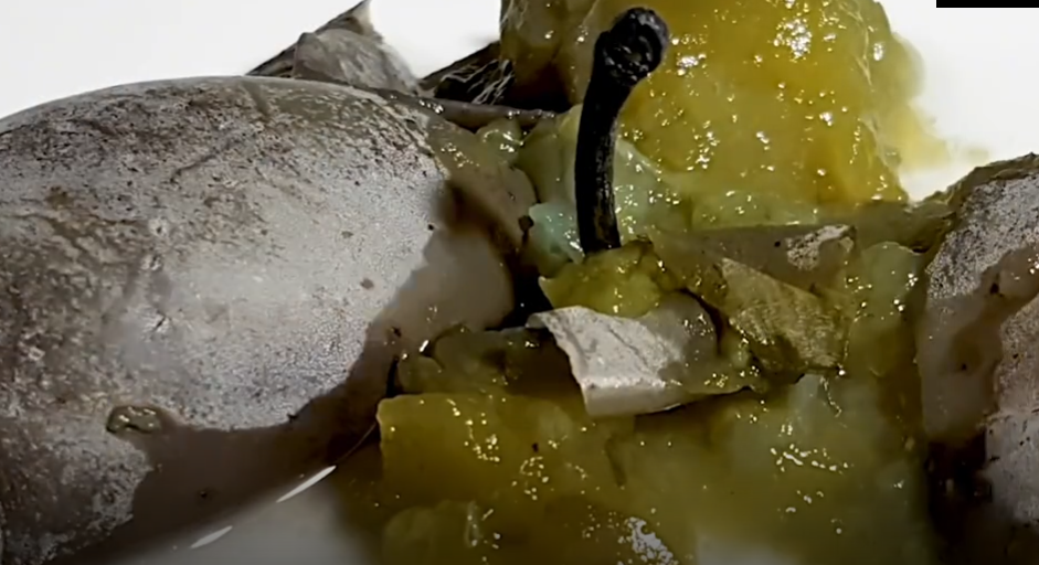 将表面保鲜膜慢慢划开,水面上层已经变成了深褐色,并充斥着很多白色的霉菌,下层则是一团黄色的胶状物,就像果冻一样,既Q弹又丝滑。我们将水体上层物质全部搅碎,然后将中间的苹果拿出,看起来并没有太多腐烂,而且没有臭气熏天的味道,反而有点像东北冻梨的感觉。我们用水果刀从中间切开,发现内部果肉已经彻底变黄,最核心出的种子也完全变软,轻轻用手一捏,便能将内部物质直接挤出。然而,从水中拿出的苹果仅仅与空气接触了一天时间,就开始发黑长霉,并迅速腐烂。