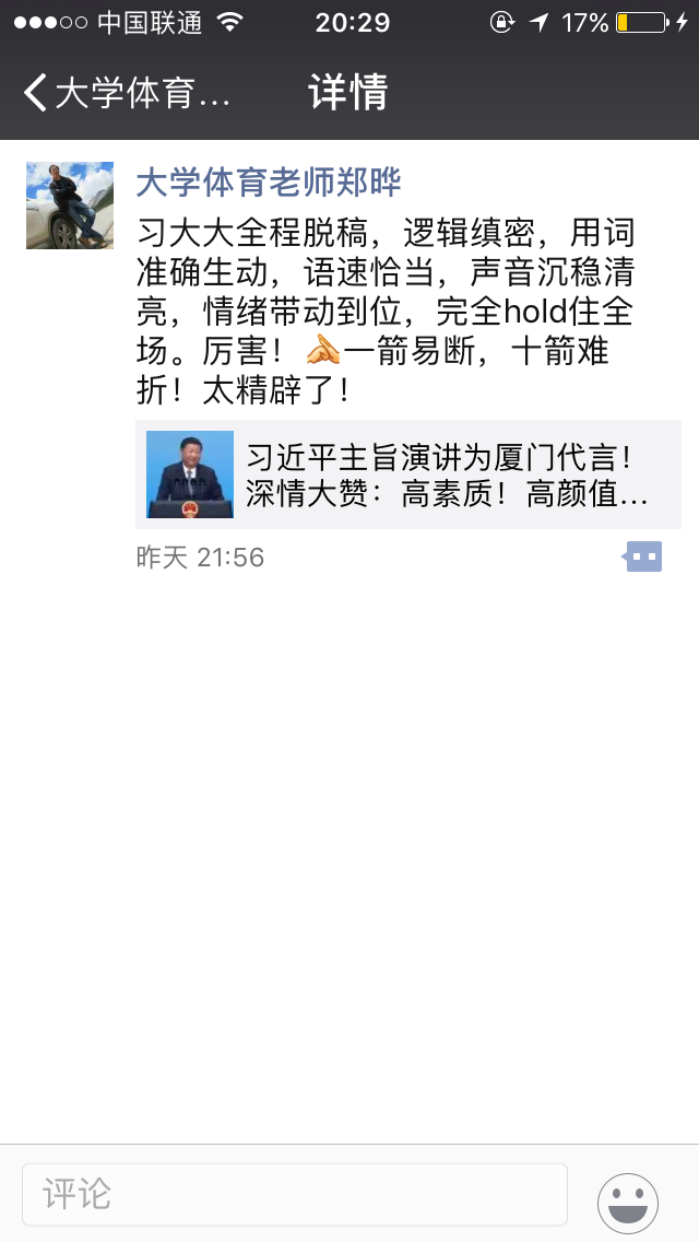 放一张我大学老师的朋友圈,看他作为厦门人的自豪感。