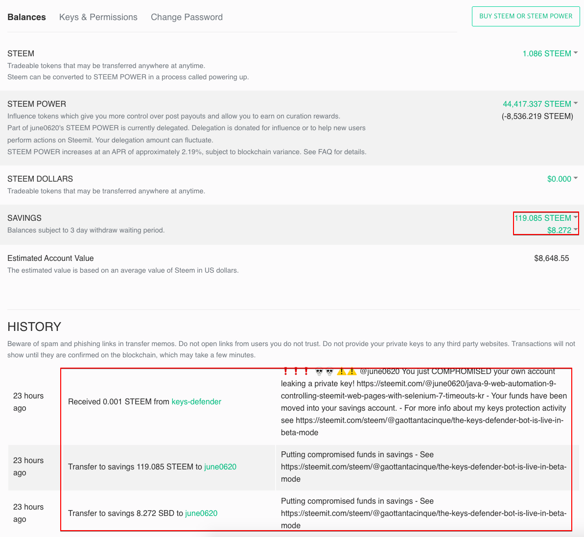 不仅如此,说还把我发帖赚取的steem和sd都移动到了SAVINGS账户,晕,这个也行?