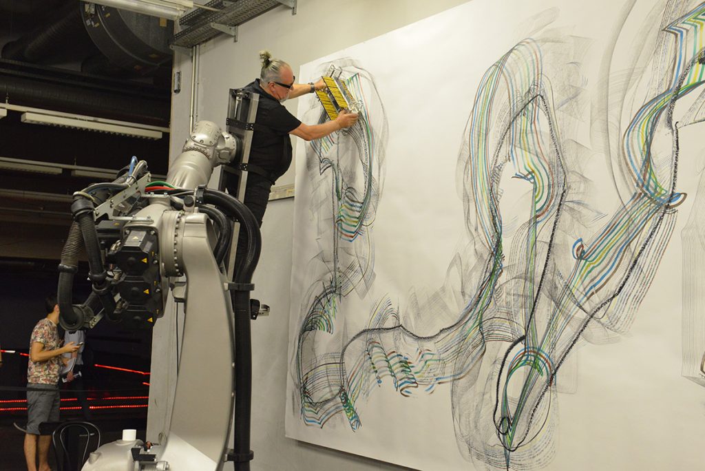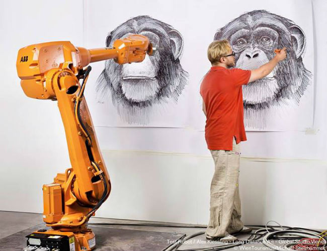 上图是一位叫做 Dragan iLiC 艺术家的项目,人充当机器的笔刷,由机械臂控制着人去作画。