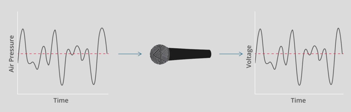 比如话筒,持续接收声源震动,转换为连续变化的电压,再转换为数字信号: