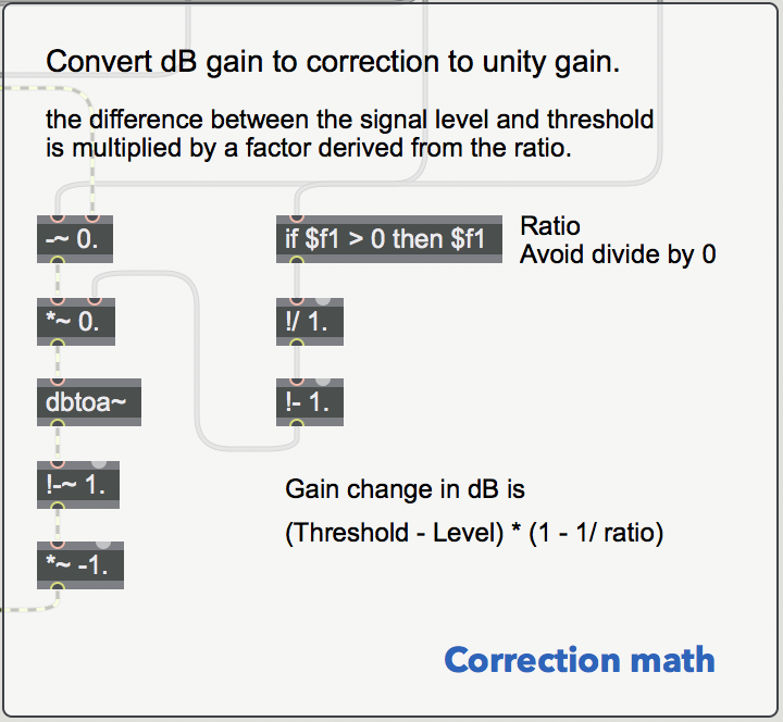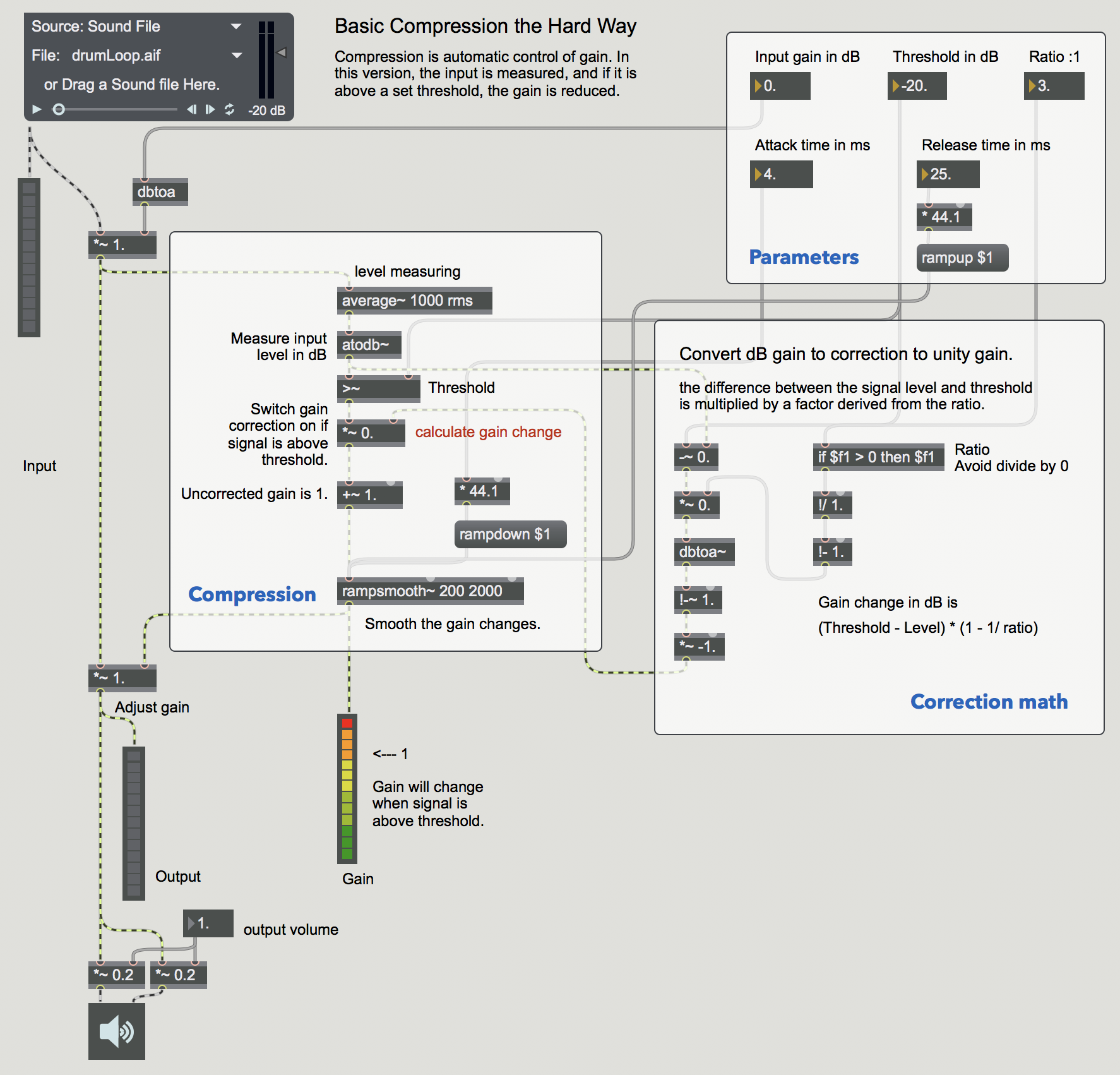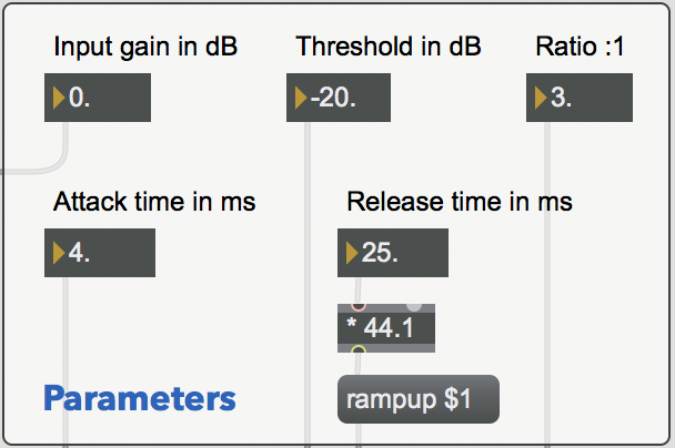 然后将计算值再换算为 amplitude,输出到 compression 的主流程中,最后再加一道 rampsmooth~ 来平滑 gain 的变化。
