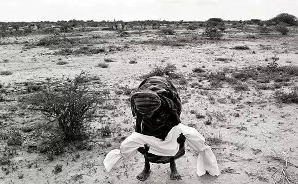 1992年,索马里正发生着无法控制的饥荒。把孩子送给土地这一庄严的行为表现了人类对土地的信仰,其间充满愤怒、绝望、痛苦,却又让人尊敬和充满希望。发自内心甜蜜的爱和对死亡的接近,因为饥荒而变得富有悲剧性。这幅照片反映了世界所遭受的痛苦和灾难,也反映了人类的信心和命运。