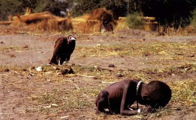 这是非洲大陆最绝望的写照----以最直白的方式颠覆了人们对饥饿的认知。1993年,苏丹陷入令人恐怖的大饥荒中,荒凉的土地上除了枯黄的杂草就是累累白骨。南非摄影师凯文·卡特因这幅照片声名大噪,同时也引起了争议,有人指责他只为拍照却不去救助这个快要饿死的孩子。凯文迫于舆论的压力患了严重的抑郁症,最后自杀身亡。他在生前留下的字条上写道:“真的、真的对不起大家,生活的痛苦远远超过了欢乐。”