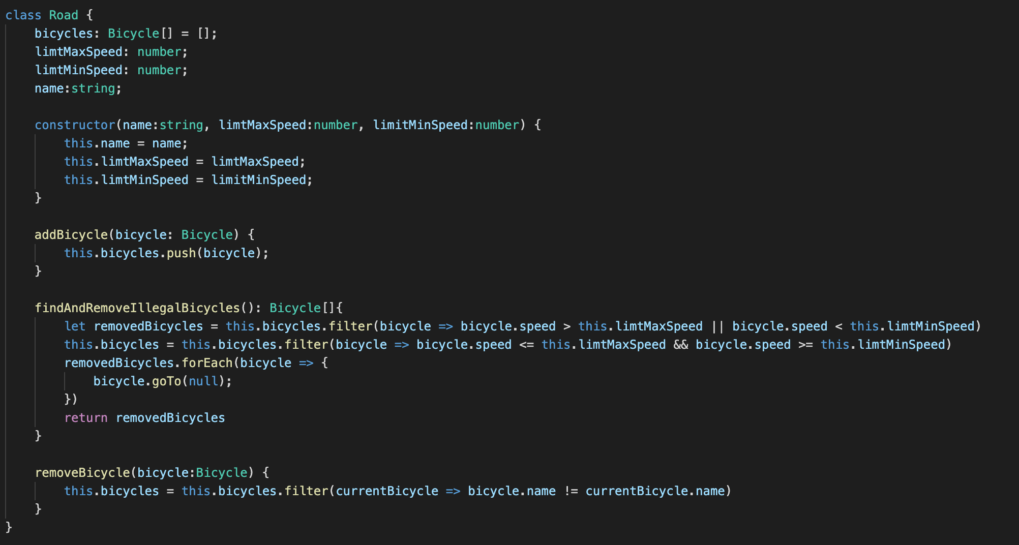 他可以讓單車進來(addBicycle), 離去(removeBicycle)或是找出不在限速範圍內的單車驅趕出去(findAndRemoveIllegalBicycles)。