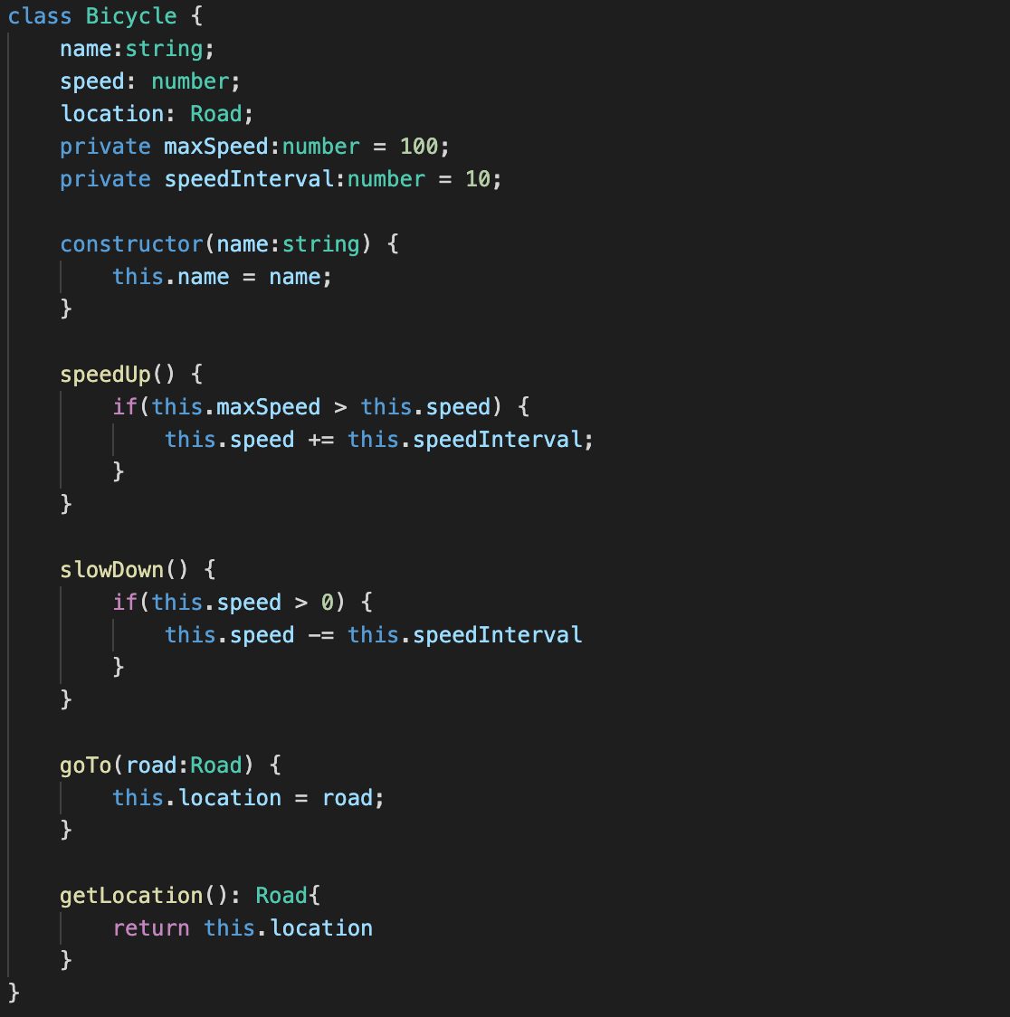 若果現在被要求單車的加減速時的間隔(speedInterval)改為15, 我們就回到單車的class修改。但我們忘記了原來的加速(speedUp)和減速(slowDown)的邏輯是以加減速時的間隔為10作為前題來寫。我們忘了修改加速(speedUp)和減速(slowDown)。這就出問題了。單車A的現在速度(speed)可以大於最高速度(maxSpeed)。加速10次後, 單車A的現在速度(speed)是105。這速度完全超出了公路A的限速。因此, 被驅趕出去, 而去不了公路B。