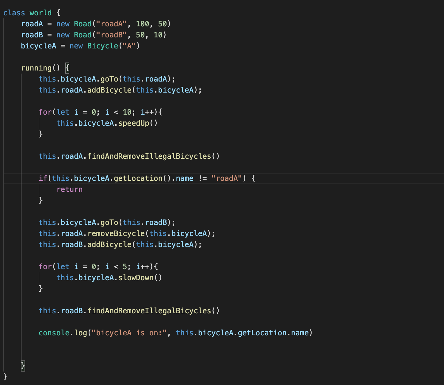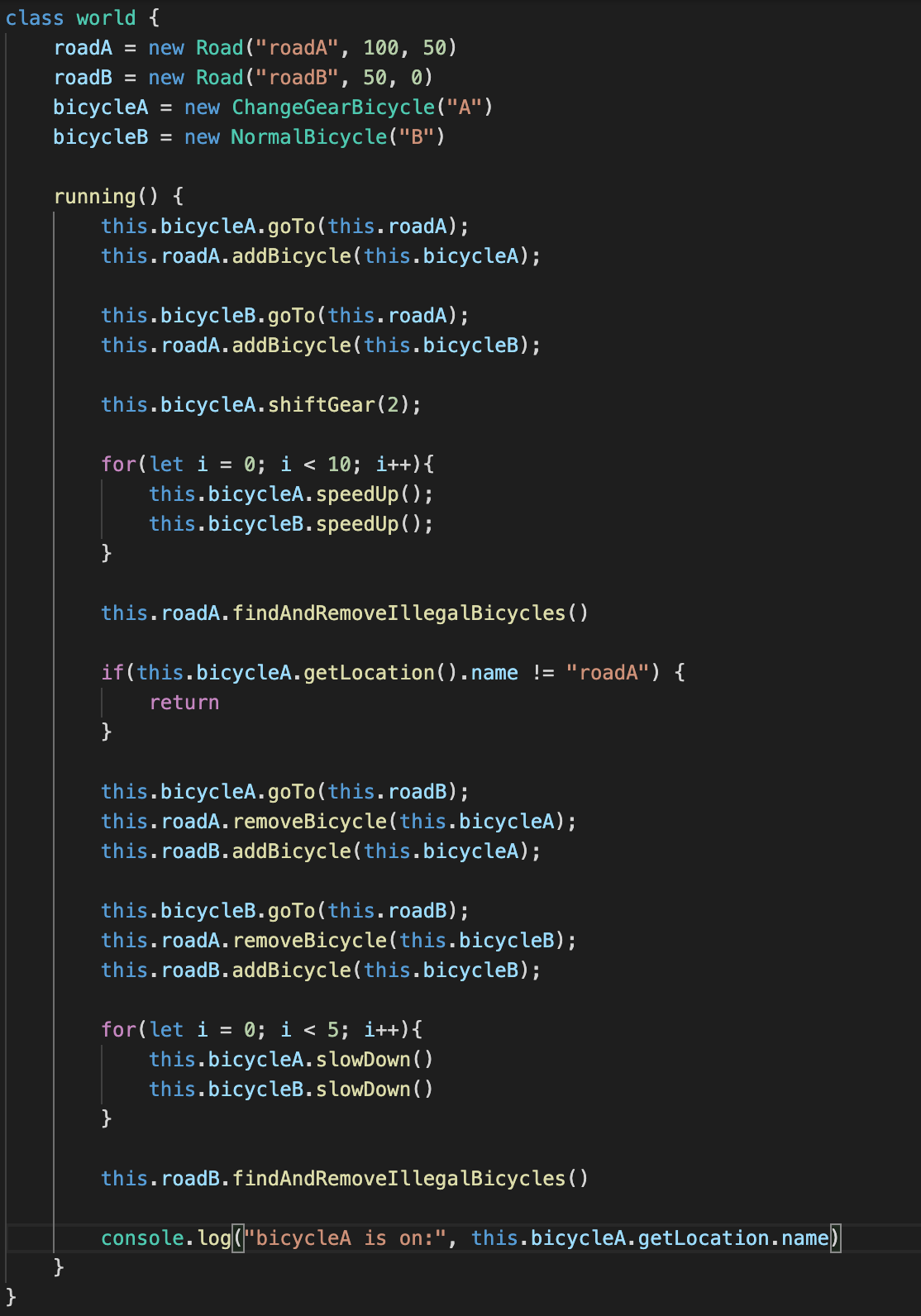他就是運行程式的地方。我們要運行的內容就在running()裡。我們先在世界裡創造兩個公路, 分別是公路A(roadA)和公路B(roadB)。最後, 就是單車A(bicycleA)。
