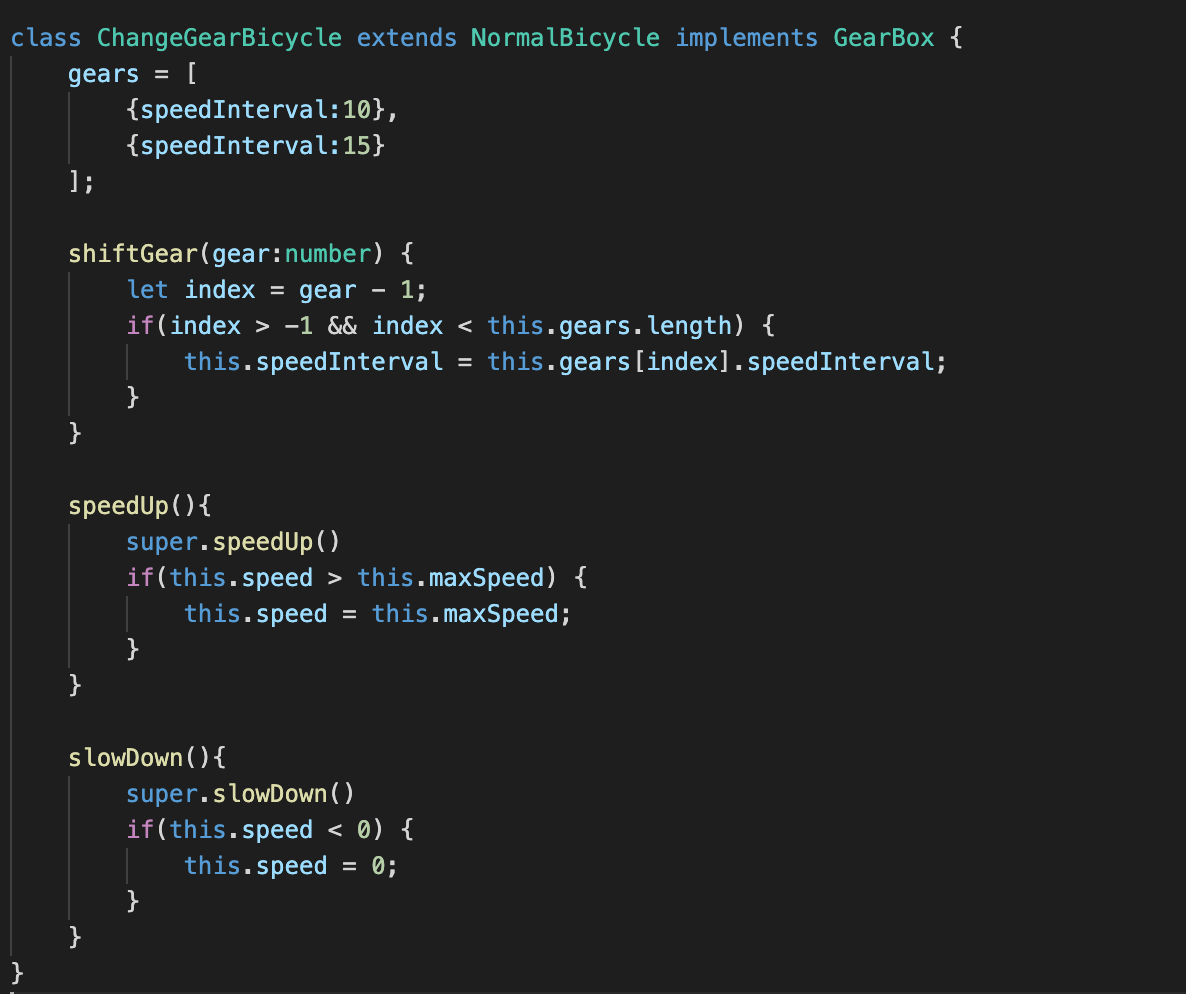 這個單車繼承了普通單車的功能和要求實作變速器的特性。因為普通單車的加減速邏輯是以加減速時的間隔為10作前題,所以我們要覆寫加減速的邏輯。這裡覆寫為用了原來的邏輯再做檢查。若大於最高速, 就設為最高速。若小於0, 就設為0。這樣不會改動了普通單車裡的內容, 而我們還能創造我要用的新class。