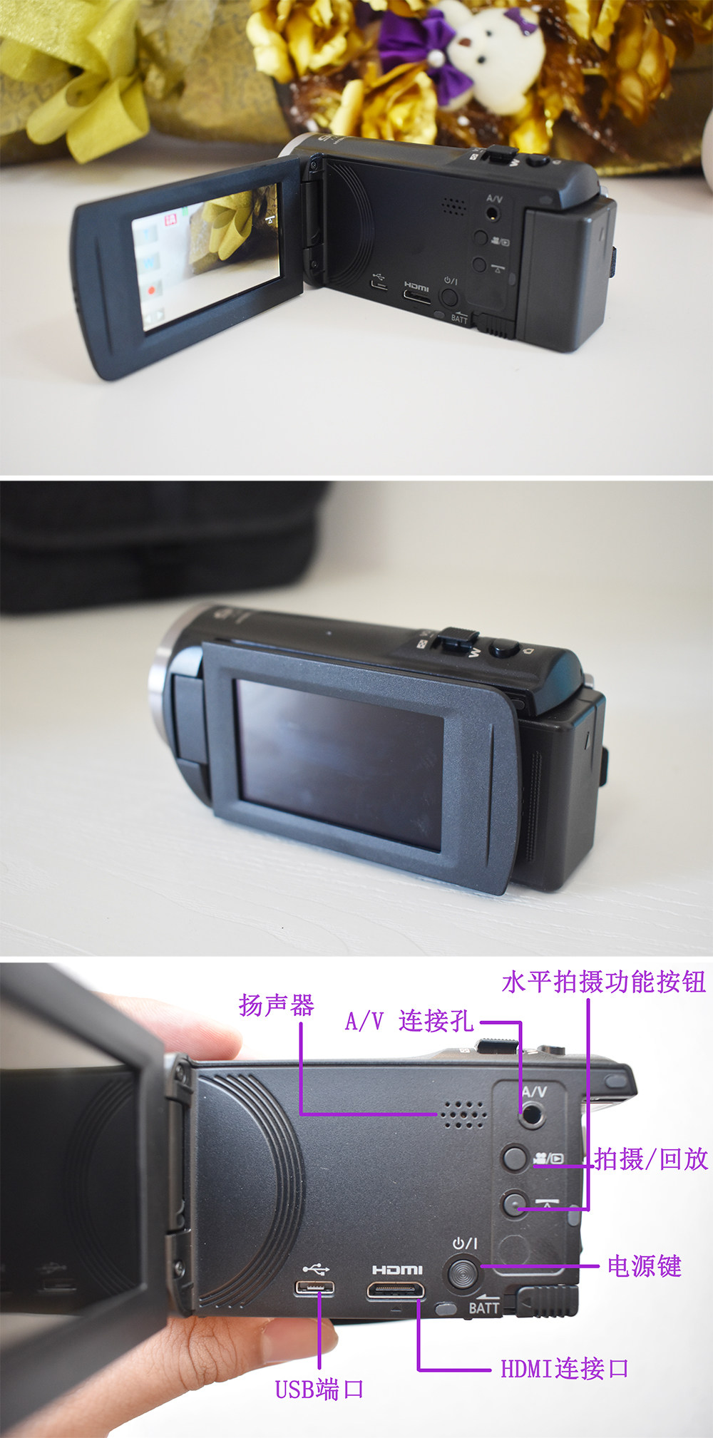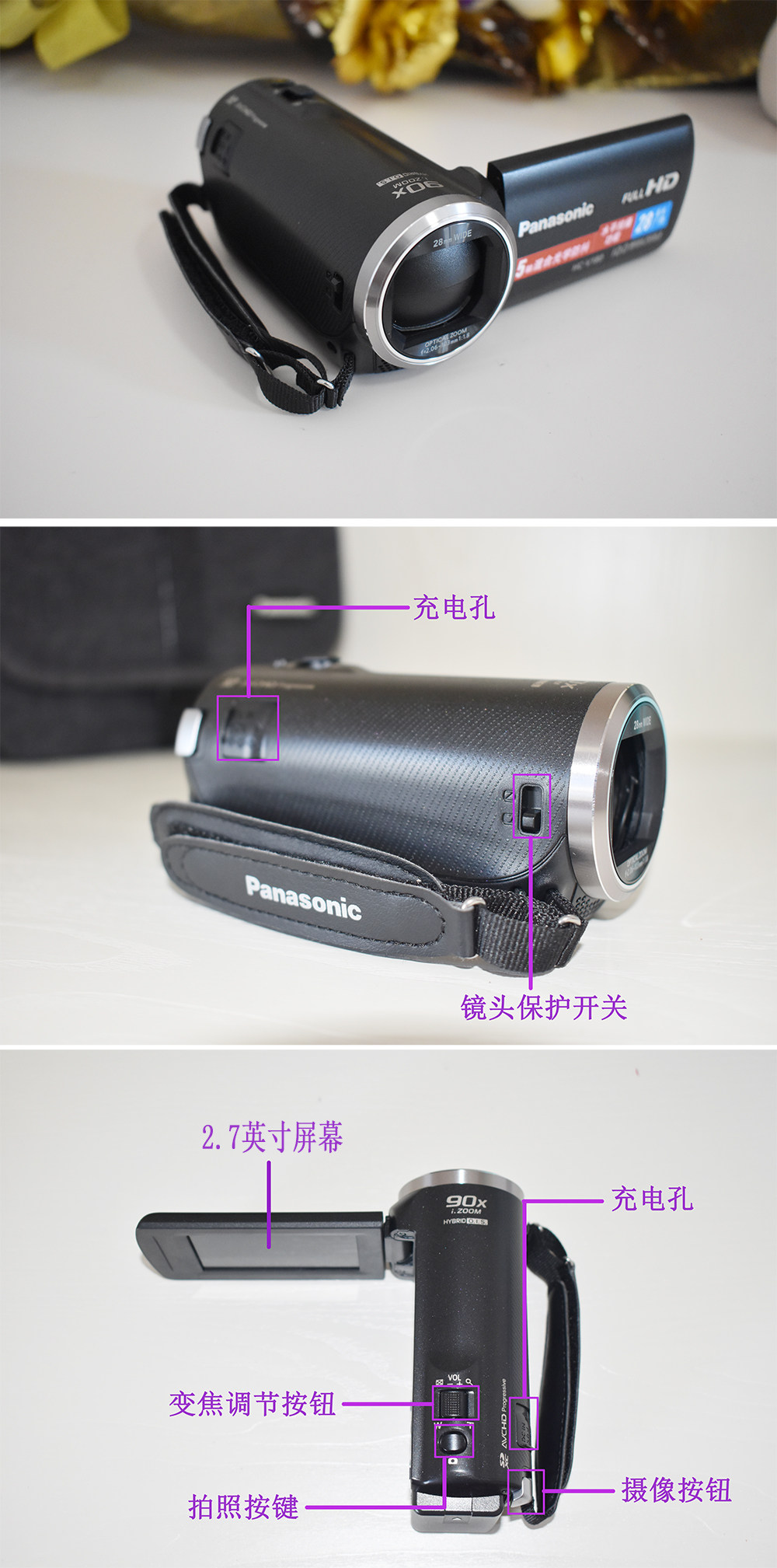 攝像機擁有一個2.7英寸的可觸摸荧幕,可以拍攝1920*1080分辯率的視頻,側面是DV的操控面板,擁有電源開關鍵、拍攝鍵、各種連接埠等,使用起來也是非常簡單方便。