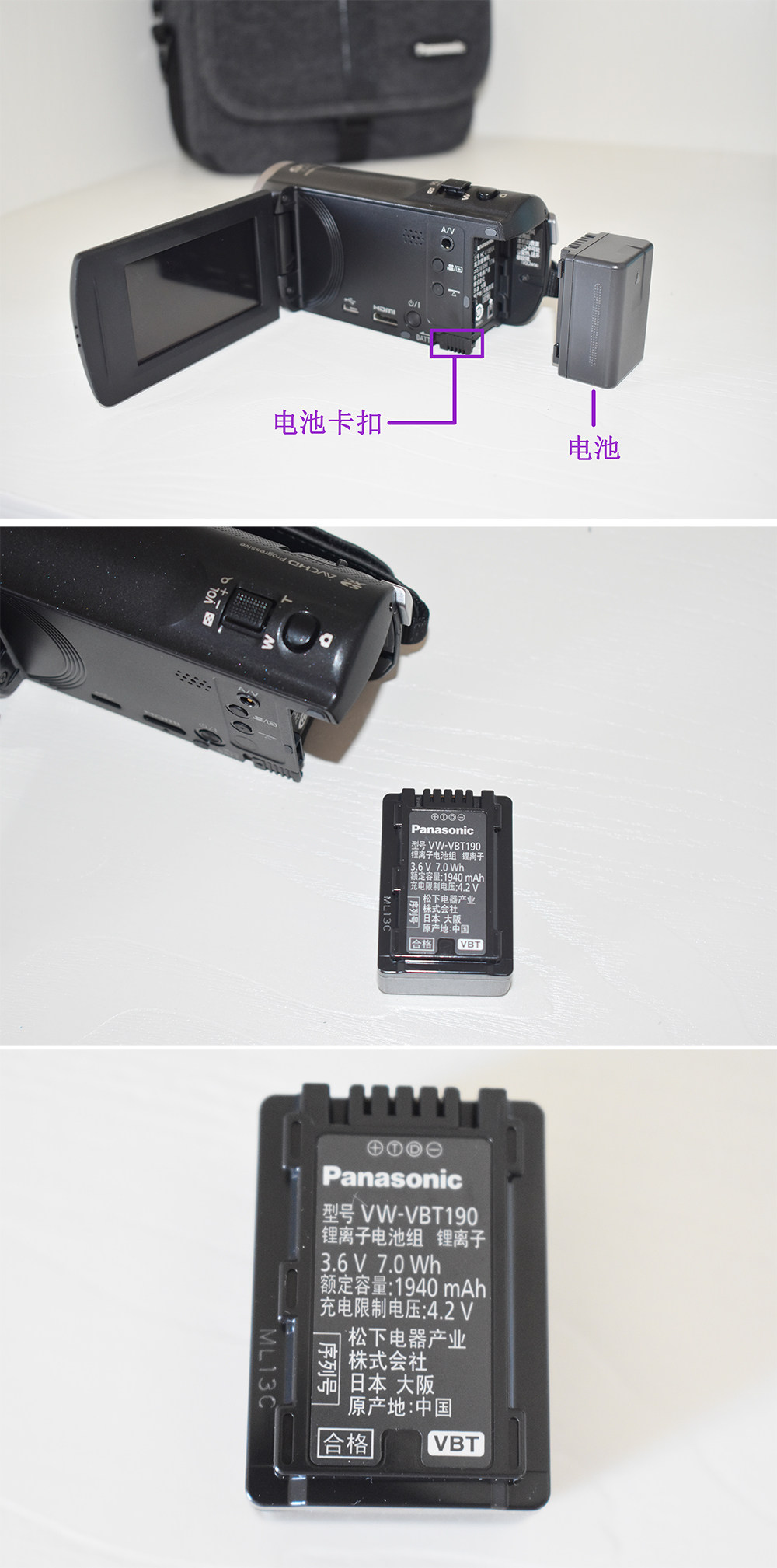 由於是試用裝,所以只給我配了一塊電池,如果需要的話自己再去買一塊電池也就一百多,基本不是什麼問題。電池的安裝非常簡單,在DV的後邊有一個卡扣,直接把電池安裝上去就好了,拆卸的時候扣下卡扣就可以了。配的這款松下鋰電池擁有1940毫安培的電量,能够支持1個小時多的視頻拍攝,個人覺得再多買兩塊電池會比較受用,外出旅遊的時候就不會擔心電量不够用了。