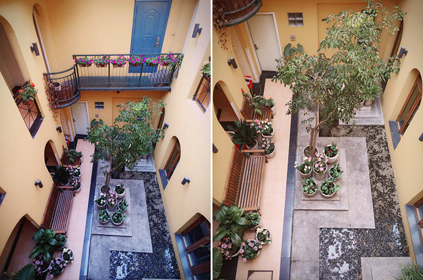 左邊圖片用蔡司的廣角鏡頭拍攝成像,和右邊iphone6plus的鏡頭拍攝做了對比,用肉眼觀看,明顯左邊蔡司外掛鏡頭的拍攝,提高了光的透射率,使成像看著更為逼真,而且在同位置同角度很明顯的看到,廣角鏡頭拍攝的空間更為廣闊,雖然遠景看著變小,但是色彩卻更加豔麗些。