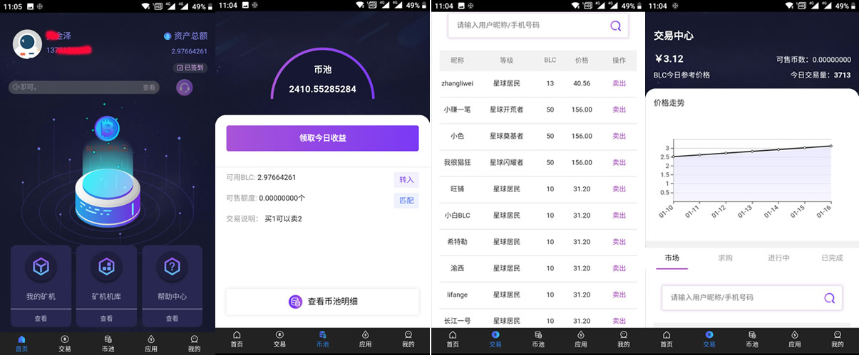 比邻币BLC,平台升级成5.0模式,注册实名送900币矿池,每天释放,买1卖2,取消了算力要求,散户可以变现了,现在3元一币