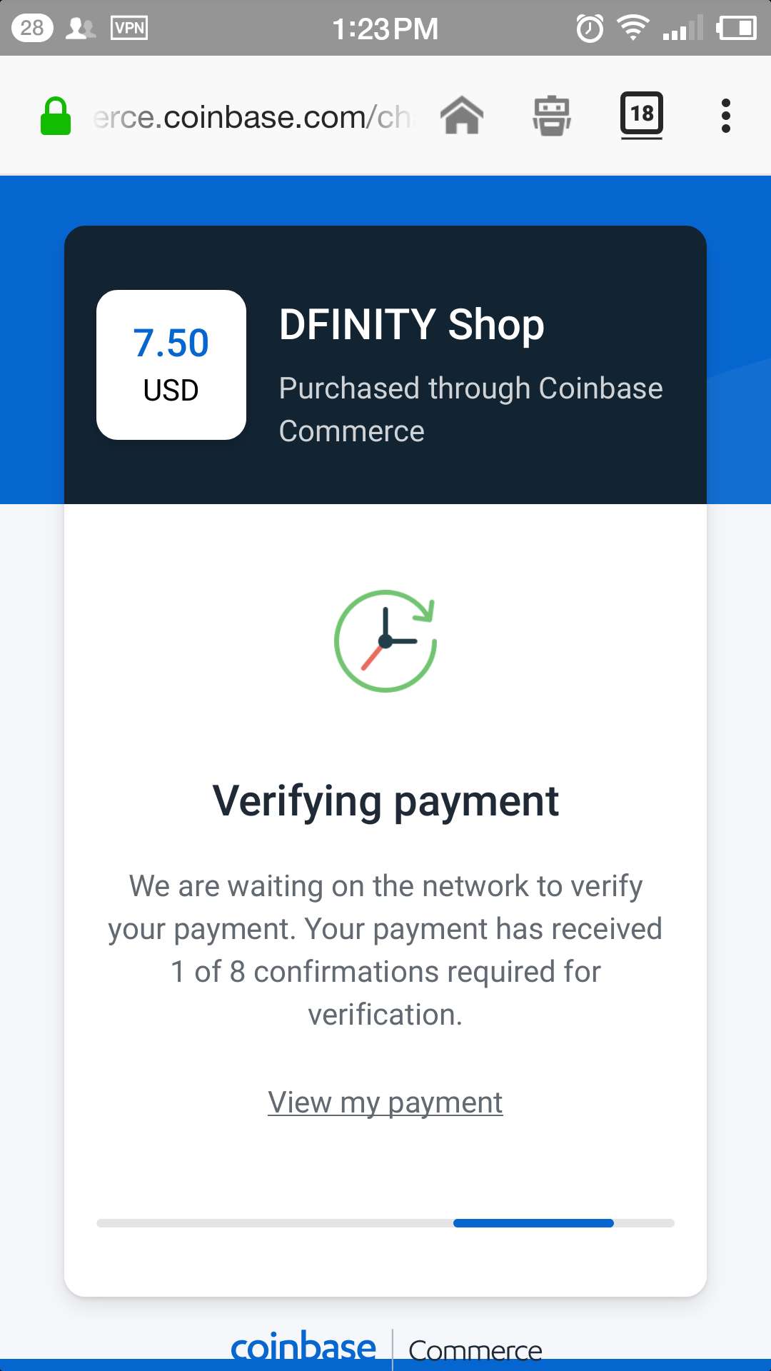 这时候发现下面还有个coinbase的数字货币支付选项,团队果然是服务周到,为广大币友准备了专用付款通道。coinbase支持BTC,BCH,ETH,LTC多种数字货币支付方式,选择ETH后会显示要付的数量和打币地址。直接打开钱包转账,几分钟就已经通过八次确认了,一笔跨国交易就完成了。