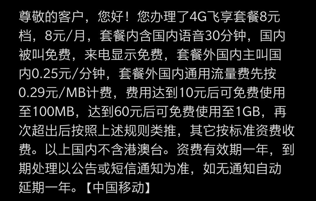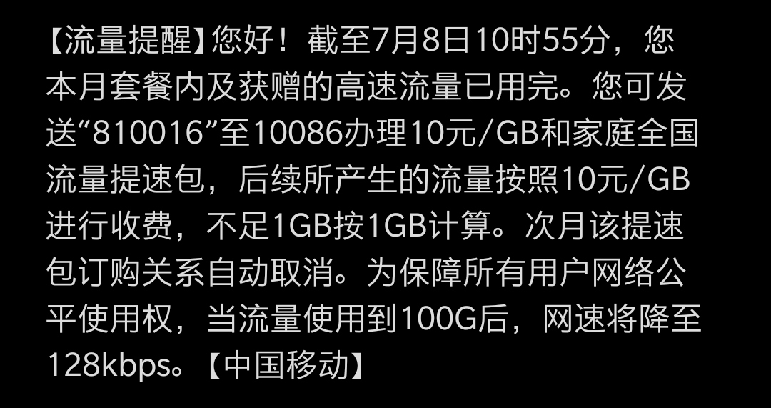 这招真管用,不到两天时间,接到移动一个客服的电话,态度挺好的,和我协商解决这个问题,一个说法就是他们现在也不很清楚为什么网速这么慢的原因,提出给我每月赠送10个G的流量加速包,我想着就算你送我10G,超过之后网速还不是一样,所以我坚持办理8元保号套餐。她答应帮我上报,然后一个小时候,我就收到了办理成功的短信。而当我办理了8元套餐后的几天,中国移动又主动赠送我10G流量,我就不清楚他们的用意了,反正,任何要我升级资费的陷阱都被我拒绝了,我现在已经把移动的卡放在我很久没用的黑莓上,并且关闭了网络。