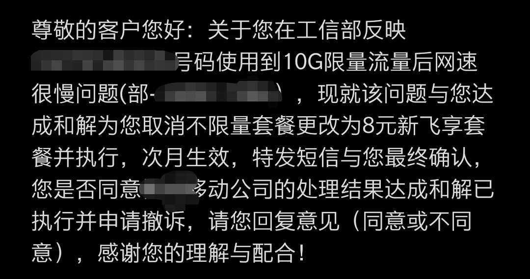 我一气之下就在工信部的网站上投诉了他们,我要求中国移动要么解除对网速的限制,要么给我办理8元的保号套餐(因为号码绑定了太多的东西,暂时不能扔)。