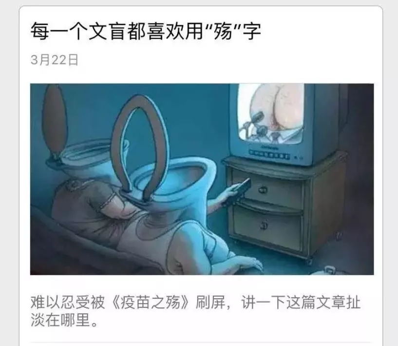 而大V“和菜头”,2016年在公众号上写了一篇激进的《每一个文盲都喜欢用“殇”字》,提出2016年山东非法疫苗事件其实与郭现中的《疫苗之殇》有本质区别,不能因此而否定疫苗的伟大成果和重大作用,再次引起了公众的讨论。