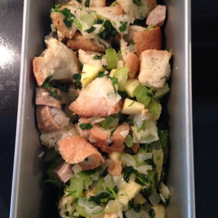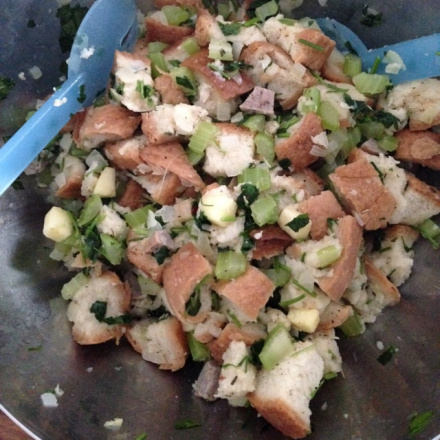- 苹果去皮切丁,芹菜洗净切丁,白面包切块,香菜切碎,洋葱切碎。锅内热油,先入洋葱芹菜煸炒一下,加入鸡汤适量,倒入白面包和苹果碎中,加入盐,胡椒粉,法国香菜碎,拌匀。填料就做好了。