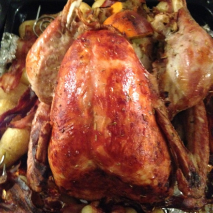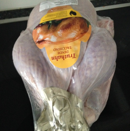 - 火鸡一只洗净,用厨房纸把表面水擦干。填入填料,橙子切半,用来封出口。腿部用牙签或绳子绑在一起。少量油加迷迭香,盐,胡椒粉,用刷子刷在火鸡表面。火鸡胸部盖上锡纸,入烤箱,170度,三小时左右。期间要在火鸡表面刷油数次。