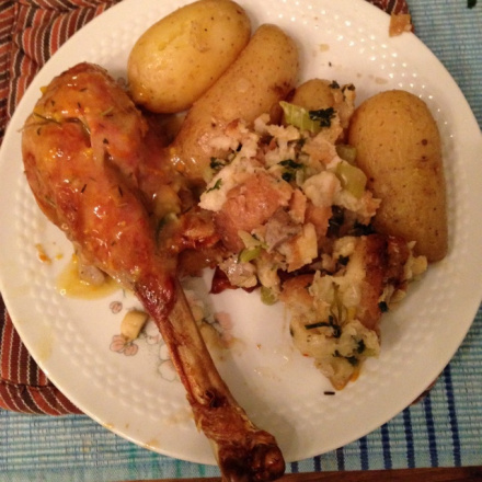 - 一个橙子的橙皮擦碎末,加2个橙子的汁,加入火鸡里流出来的汤汁和一些水淀粉,做成蘸酱。开吃吧。