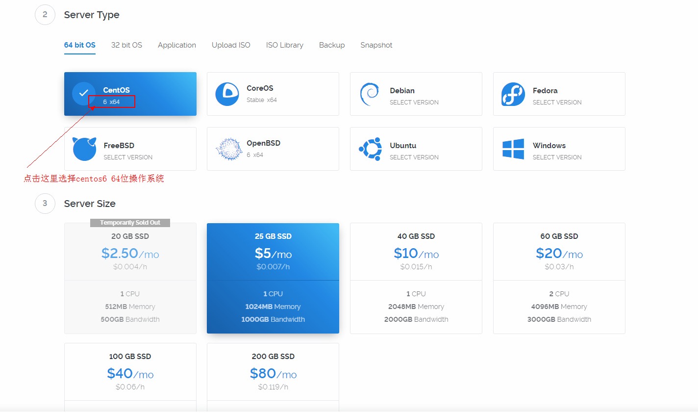 选择CentOS6 x64操作系统,然后选择5刀或其他的套餐。