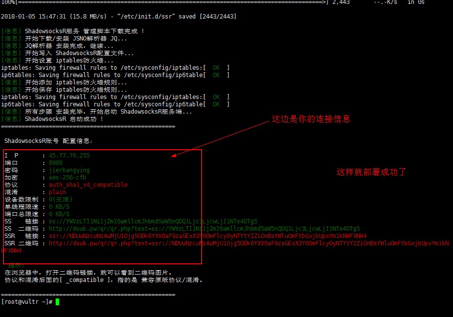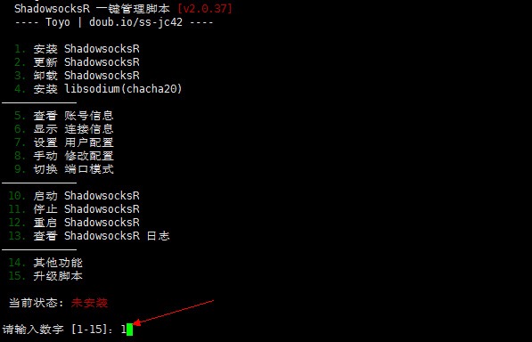 安装成功之后显示如下图,如果下次还想调出此界面,输入 bash ssr.sh;
