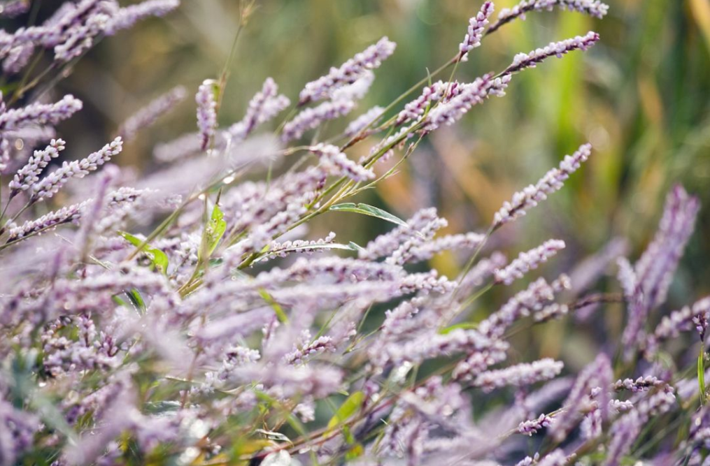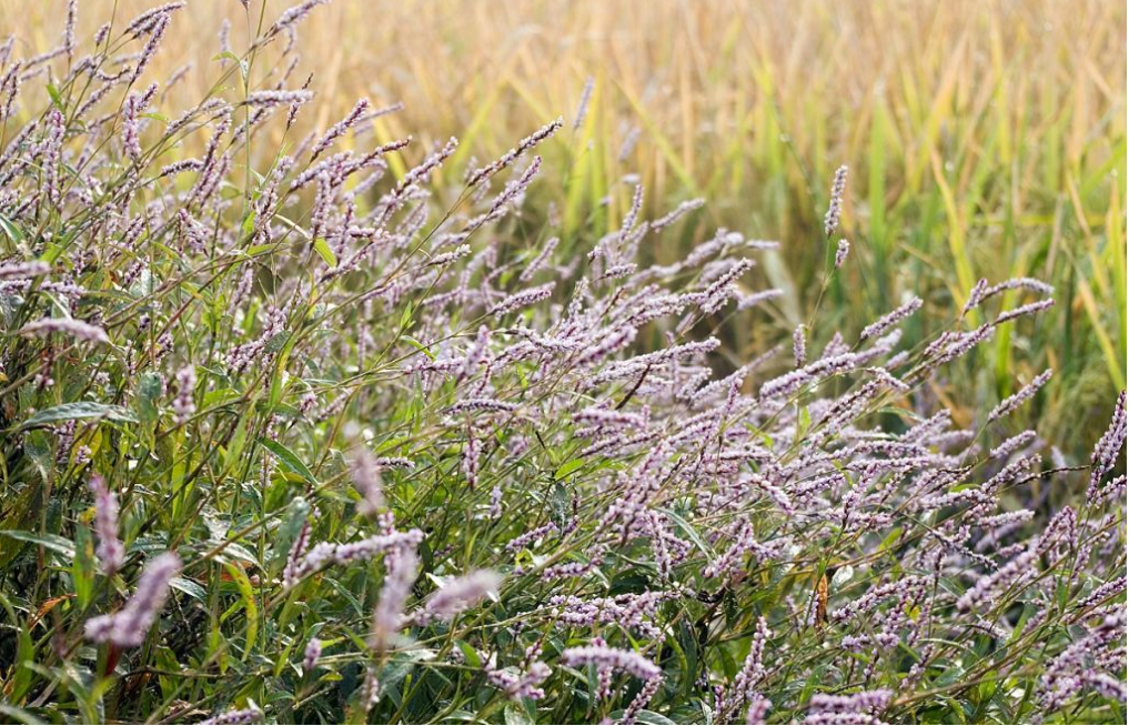 稻田边的小野花与稻田相映成趣,怒放的野花,乍一看仿佛造成时空的混乱,到底这是春天还是秋天?