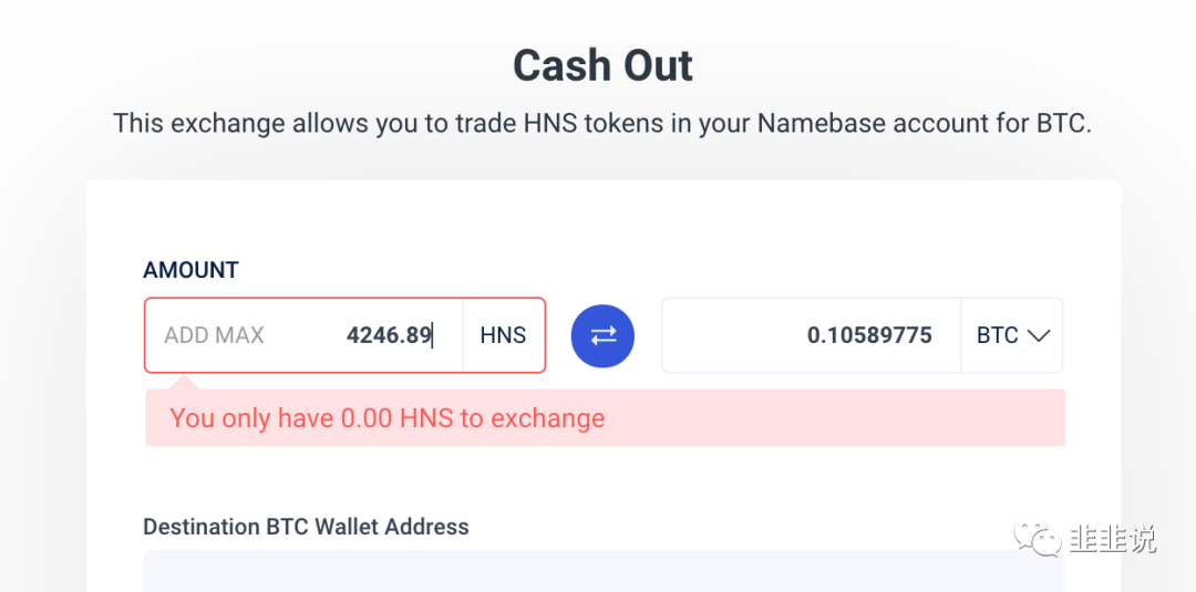 到账之后,鉴于最近数字货币行情波动非常剧烈,韭韭打算先落袋为安。这个网站很人性化的是提供了HNS和BTC的兑换方式,韭韭就直接兑换成了比特币。然后提到了自己的个人钱包里面,由于已经提现过了,所以下面截图显示可用为0。填上自己的比特币钱包地址,几分钟过后就到账啦。如果想换成人民币朋友,也可以提取到交易所直接卖出。但是韭韭作为一个屯币党,就暂且换成比特币吧。