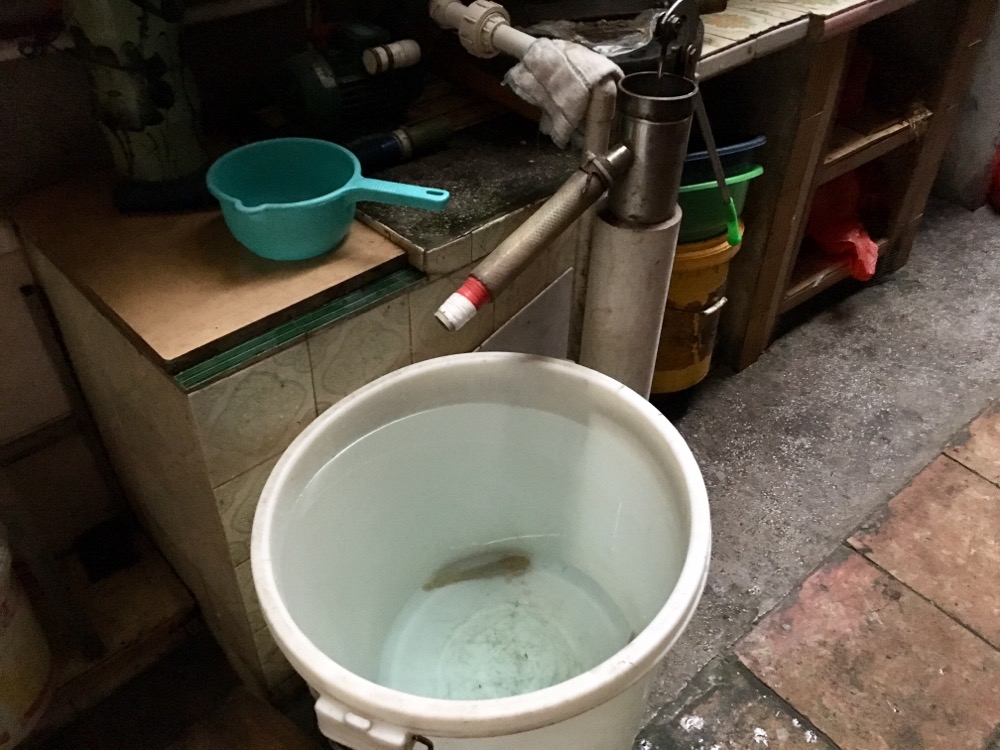 看到家中長輩抽水井旁有一大膠缸, 缸中有魚。
