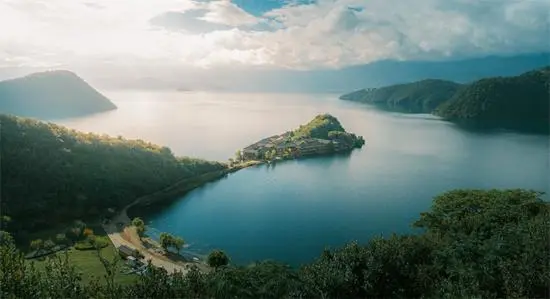 云南省丽江市宁蒗彝族自治县泸沽湖,封闭后的里格半岛在阳光的照耀下,好似吊坠一般镶嵌在泸沽湖面上。