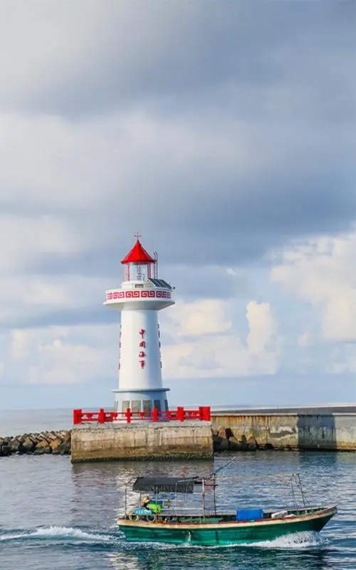 海南省三沙市永兴岛,当地渔民出海归港靠岸路过灯塔。