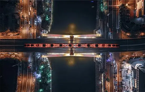 天津市红桥区,俯拍角度下的天津之眼横跨河面,来往的车辆在海河两岸穿梭。