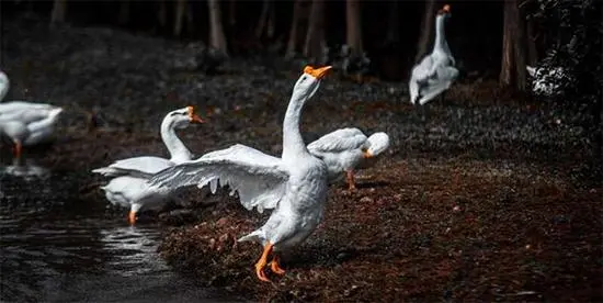 池塘边的白鹅挥动着翅膀。似乎在说,“春天,我来了。”