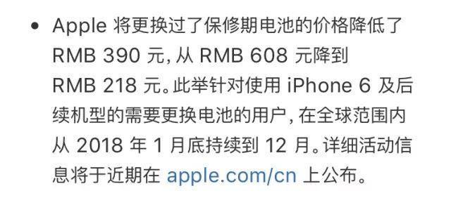 后来苹果官方回复了这一事件,他们表示自己确实是有意的降低了旧款iPhone的性能,但,都是为了电池好啊(为了不让大家的手机出现意外的关机事件)。这样一个解释根本就是苍白无力的,因为我清楚的记得苹果的意外关机事件是通过iOS的软件更新修复的,而不是他现在所说的降频。苹果你以为全世界的用户都像中国用户那么有钱想换手机就换吗?所以苹果为了让大家不生气,最后给出的政策是,給手机电池降价390元(你家的电池真的好贵),换上新电池让你的手机重新获得流畅的体验。