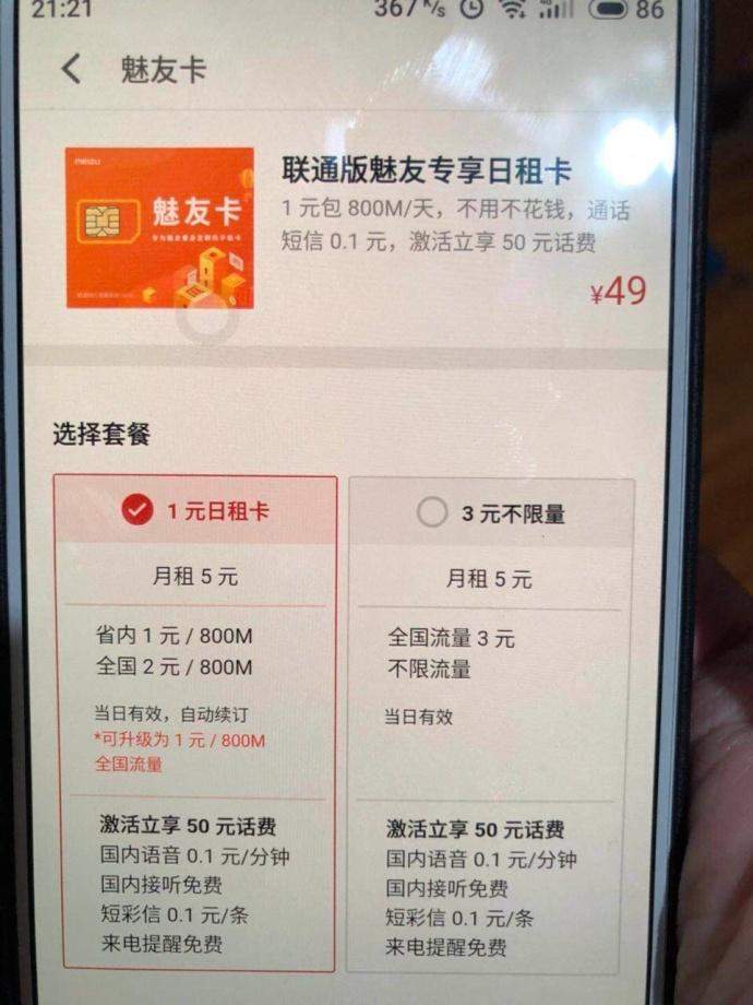 从网友给出的图片来看,这是联通版的魅友专属日租卡。售价为49元,其中一元包800M/天,不用不花钱,通话短信0.1元,激活后还可以享受50元的话费。那我们不妨对比一下小米的米粉卡和魅族的魅友卡,毕竟这两种卡都是为粉丝朋友准备的。这两种卡都有两种套餐模式,小米是1元日租和不限量日租,而魅族是一元日租和3元不限量日租,其中月租费都是5元。1元日租卡省内1元可享800M流量,全国2元800M流量。可升级1元800m全国 当日有限。