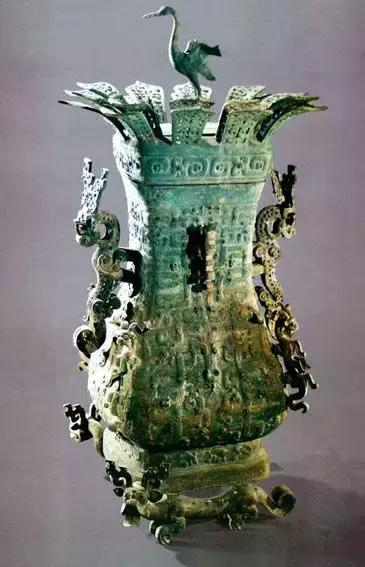 1923年出土于河南省,高120厘米,口径31厘米,是春秋时期的器物。该壶造型宏伟气派,装饰典雅华美。通高117厘米 口长30.5厘米 口宽24.9厘米。 壶上有冠盖,器身长颈、垂腹、圈足。该壶造型宏伟气派,装饰典雅华美。壶冠呈双层盛开的莲瓣形,中间平盖上立一展翅欲飞之鹤;壶颈两侧用附壁回首之龙形怪兽为耳;器身满饰蟠螭纹,腹部四角各攀附一立体小兽,圈足下有两个侧首吐舌的卷尾兽,倾其全力承托重器。其构思新颖,设计巧妙,融清新活泼和凝重神秘为一体,被誉为时代精神之象征。