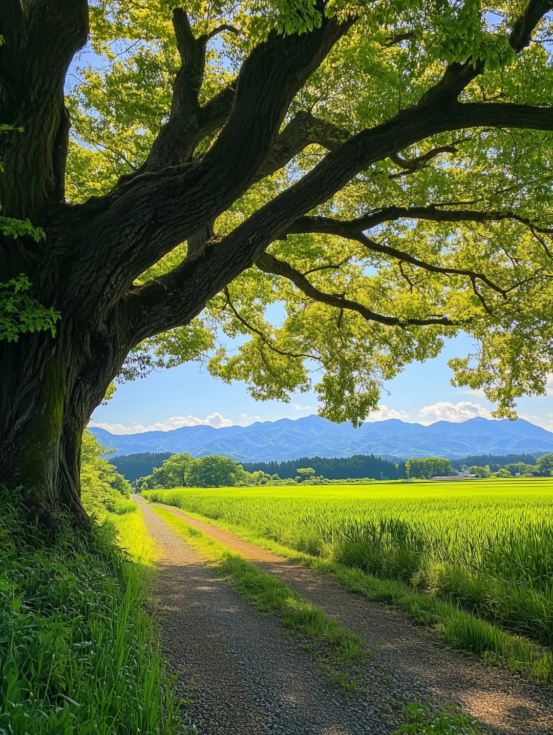 树站在那里,枝干上布满岁月的苔痕