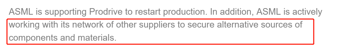 ASML只是Prodrive业务的一部分好吧(可能是比较大的客户)。所以,如果这件事是有人恶意搞出来的,针对的也是Prodrive公司,而不是ASML公司。另外,下面是引文[16]里面的一段截图,说明其提供的材料也未必是不可替换的,只是仓促之间要重新与其他供应商联系。