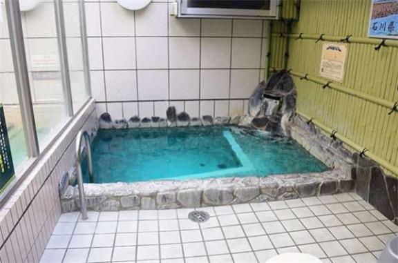 这间温泉店每个月的8、9号都会提供香菜浴,使用的是香菜泡澡剂,放进去池水就会变成蓝色,味道十分浓郁,靠近一些就能闻到香菜的味道。