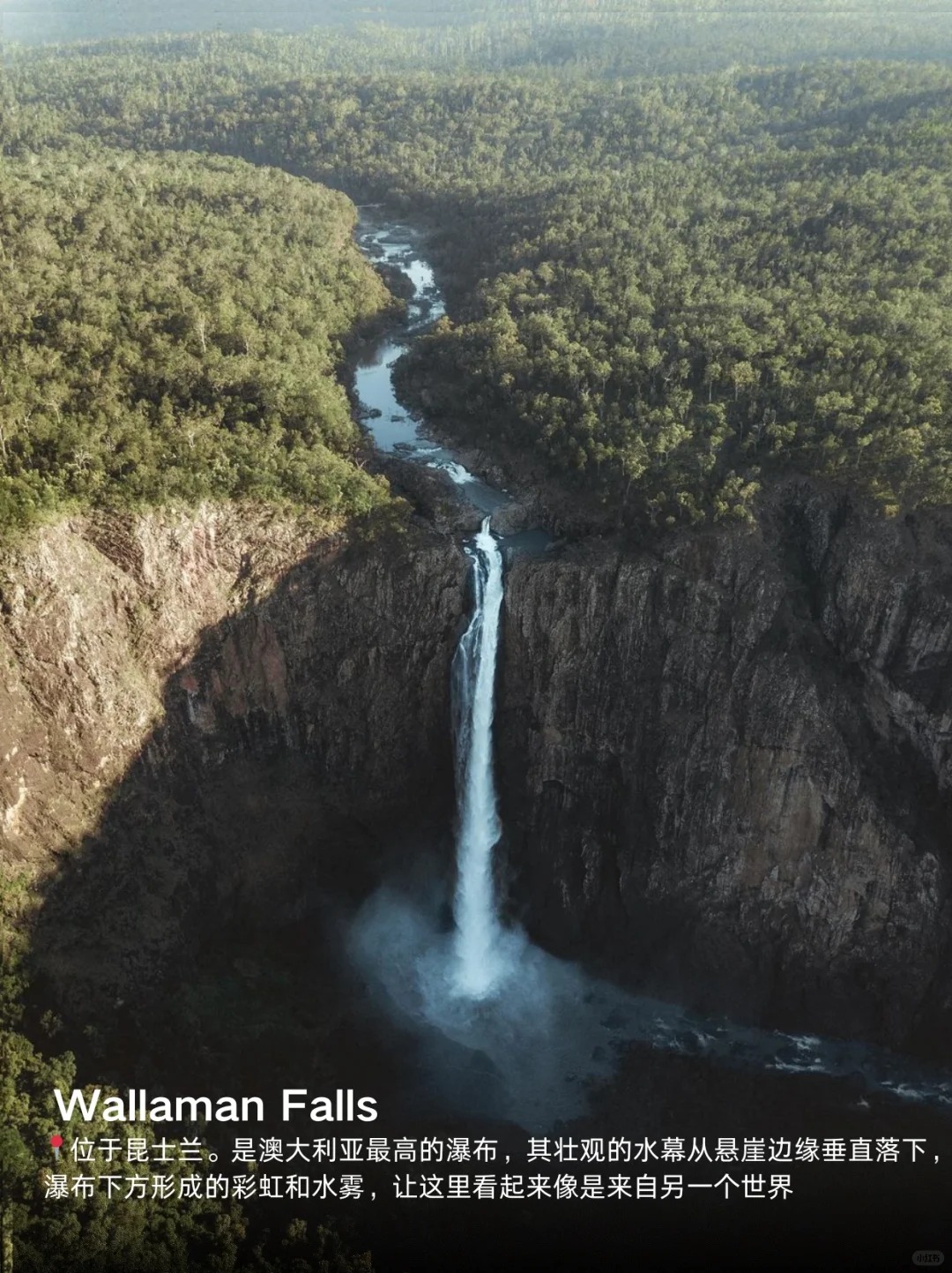 位于昆士兰的这一澳大利亚最高瀑布,其壮观的水帘从悬崖顶端垂直倾泻而下,下方形成的彩虹和水雾,让这里看起来如同一个梦幻的世界。