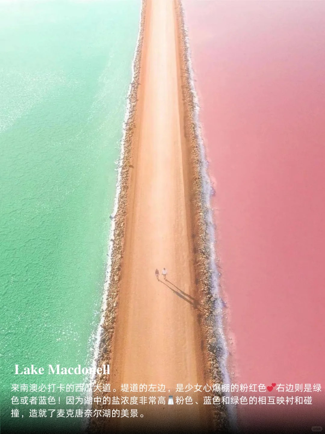 这是南澳的标志性景点,一条色彩斑斓的堤道。左侧是令人心动的粉红色💕,右侧则是清新的绿色或蓝色。由于湖中盐分的高浓度,这些色彩在这里交织碰撞,共同绘制出麦克唐奈尔湖的绚丽画卷
