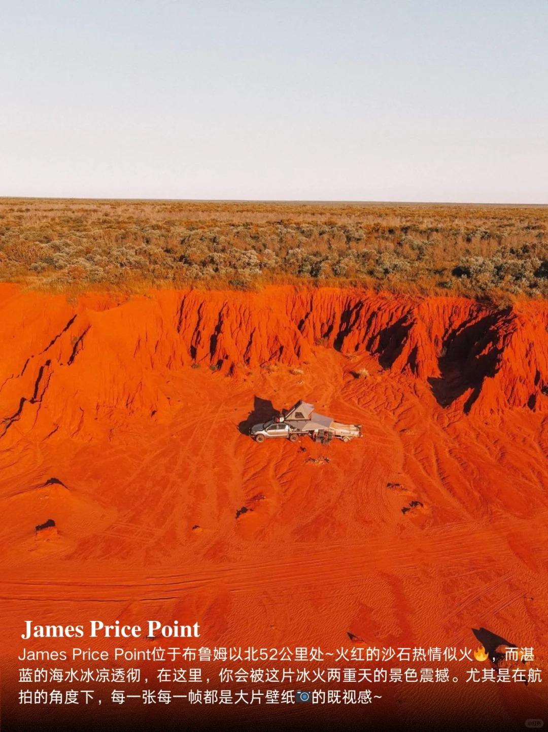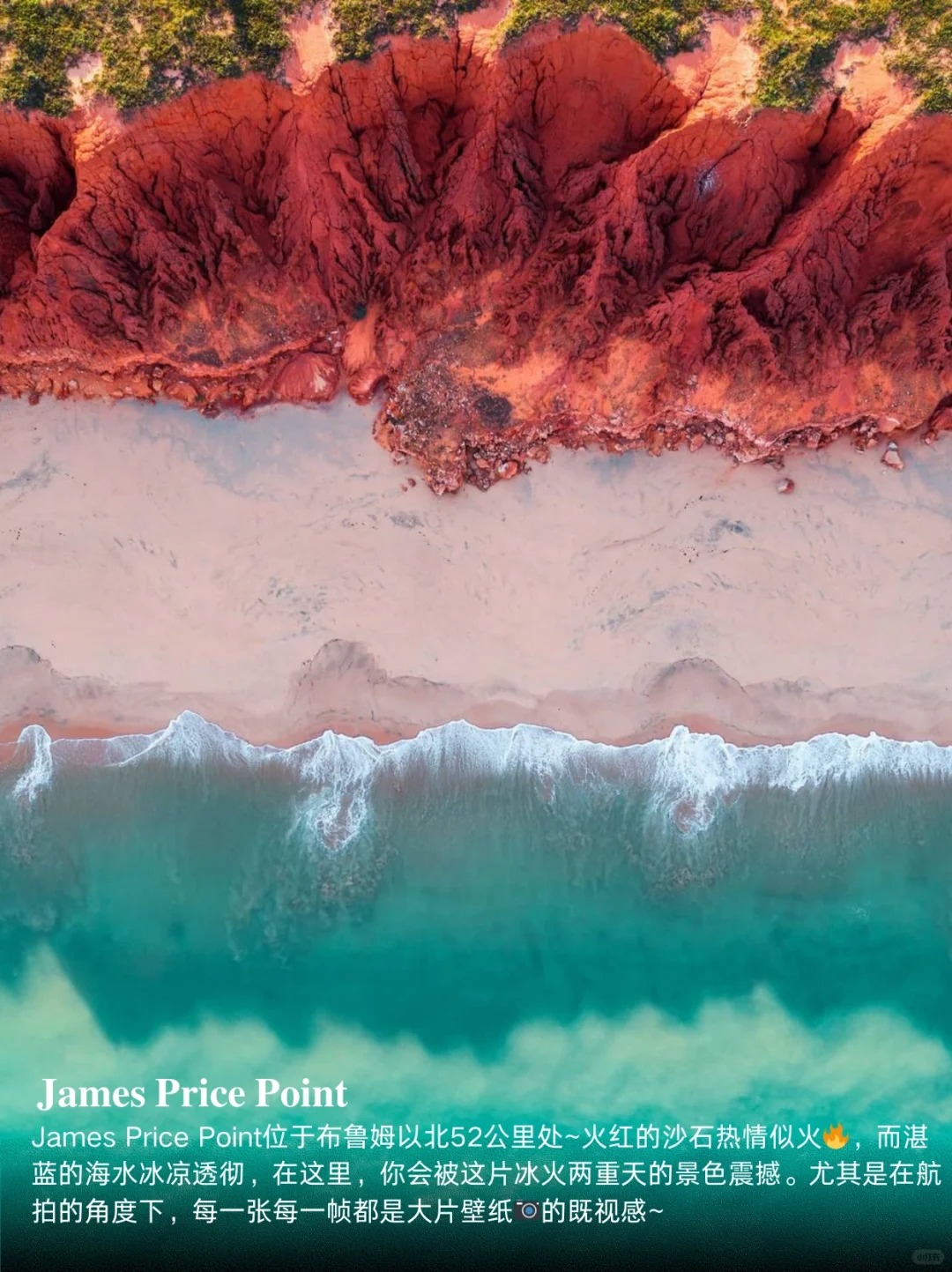 位于布鲁姆以北52公里的James Price Point,这里的沙石呈现出炽热的火红色🔥,与冰凉透彻的湛蓝海水形成鲜明对比。这里的景色令人震撼,尤其是从空中俯瞰,每一处每一景都像是精心设计的壁纸📷。